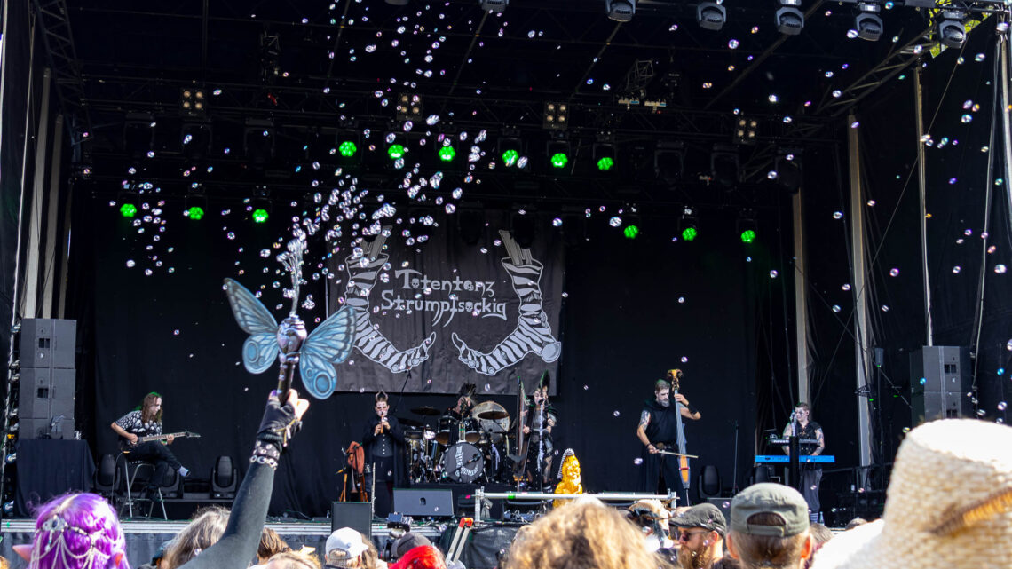 Alle der düsteren Gestalten hatten viel Spaß, sei es auf oder vor der Bühne – es wurde gesungen, gespielt, getanzt (selbstverständlich strumpfsockig), geschmunzelt und gestaunt – und sogar die Sonne lugte hinter den Wolken hervor, um sich das Spektakel anzusehen.